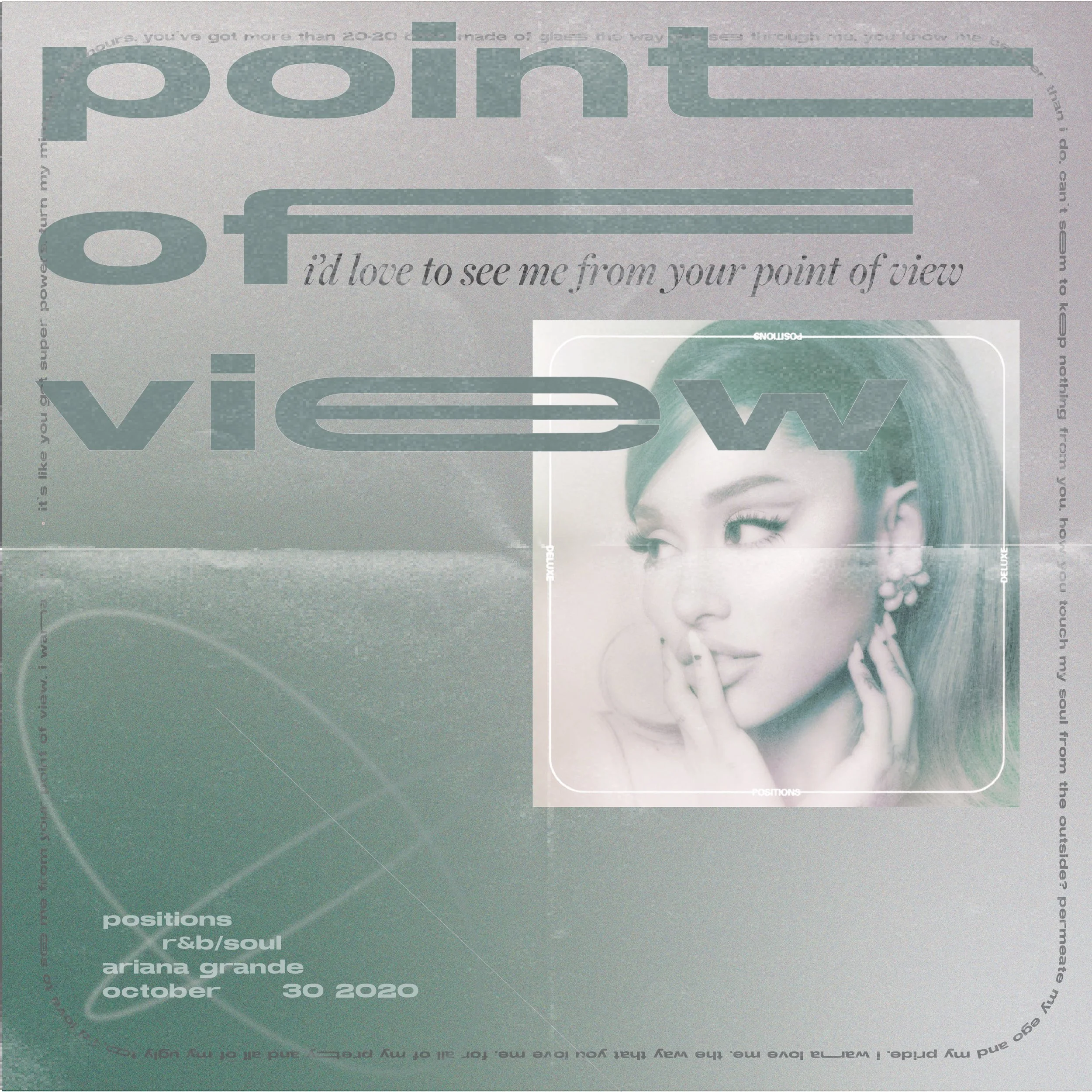 this is a very casual personal project inspired by ariana grande’s song point of view. i really liked the song, especially its lyrics. upon listening to the song for probably what would be my ten thousandth time, i decided to use it as inspiration to design a little personal project graphic.